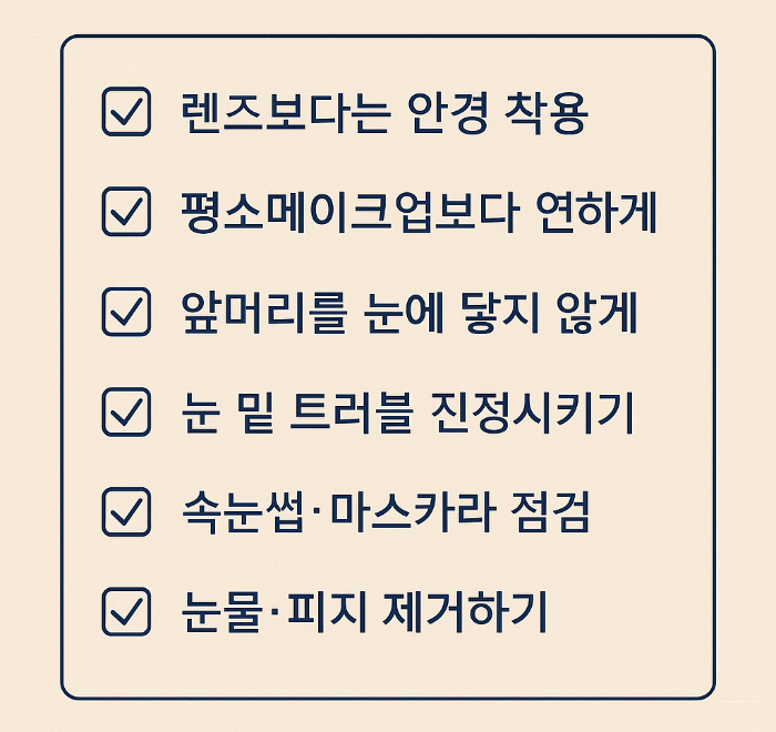 건조와 번짐을 줄이려면 주 3–4회, 40–45℃ 온찜질 10분으로 마이봄선을 관리하고, TV나 컴퓨터를 하는 시간에도 실내 조도를 너무 밝게 하지 않는게 좋습니다.(전체 등 밝기의 40% 수준)에서 화면 밝기 극저하를 피해 진행하세요.