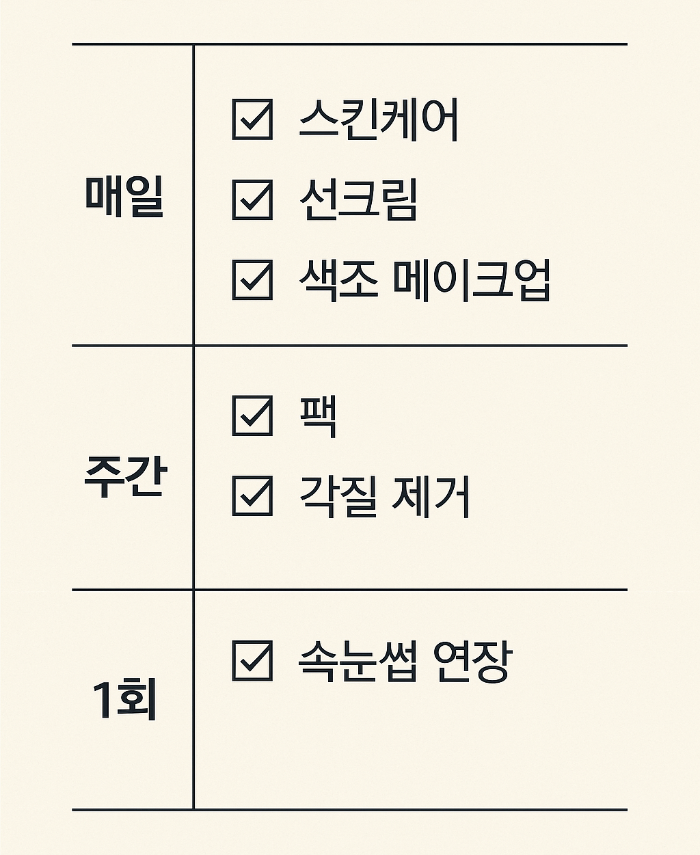 속눈썹은 뷰러를 미지근한 드라이어로 3초 예열해 큐티클 손상 없이 컬 정착력을 높인 뒤, 세럼을 소량 발라 유연성을 주고, 튜브형 마스카라로 마무리하세요. 튜브형 마스카라는 필름막을 형성해 물·유분에 강해 번짐에 유리합니다.